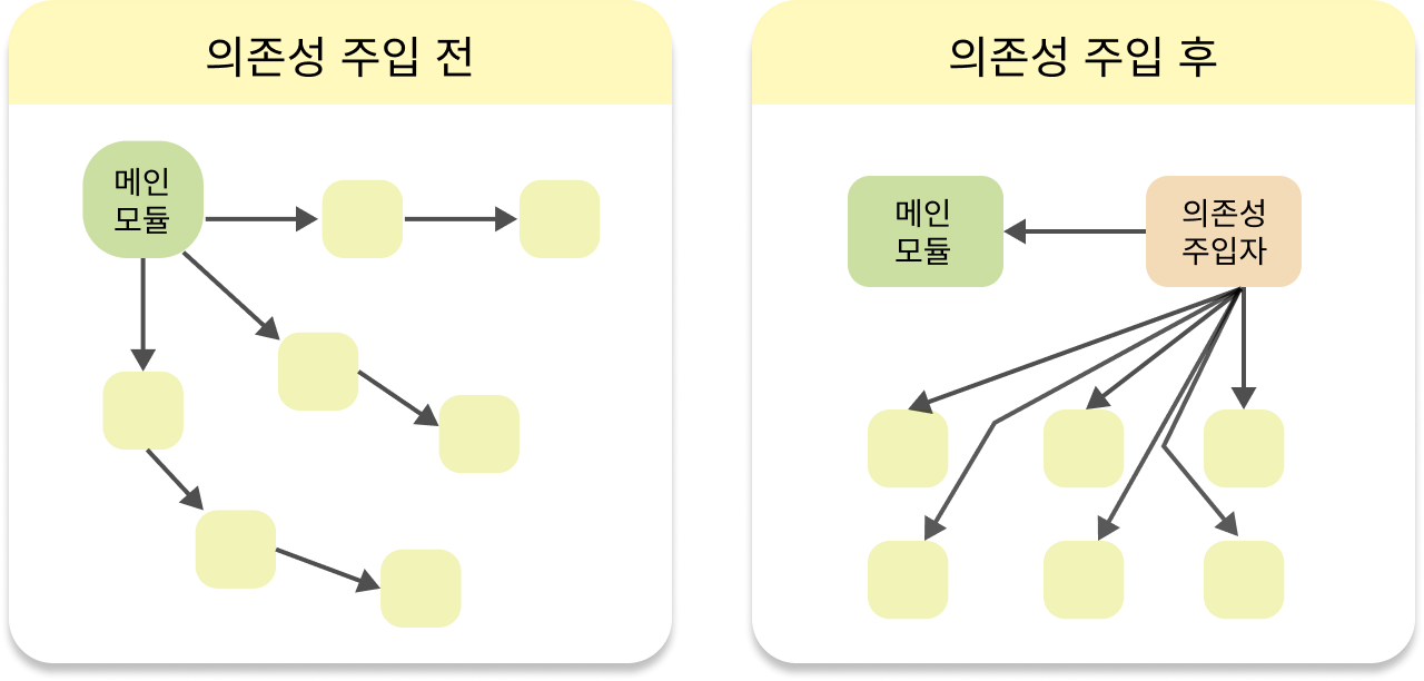 메인 모듈이 직접 다른 하위 모듈에 대한 의존성을 주기보다 중간에 의존성 주입자가 이 부분을 가로채