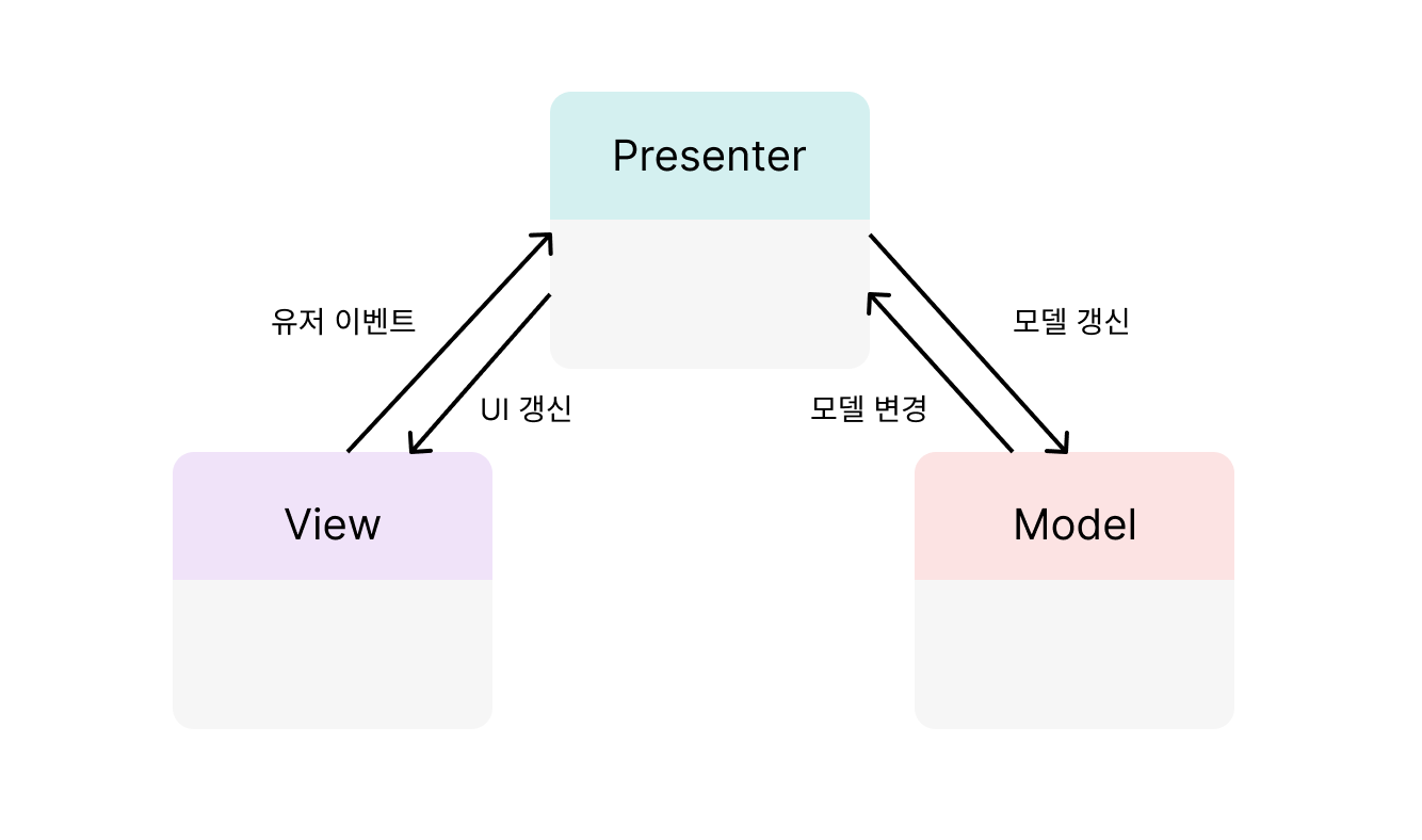 Model (모델) | View (뷰) | Presenter (프레젠터) 로 이루어진 디자인 패턴